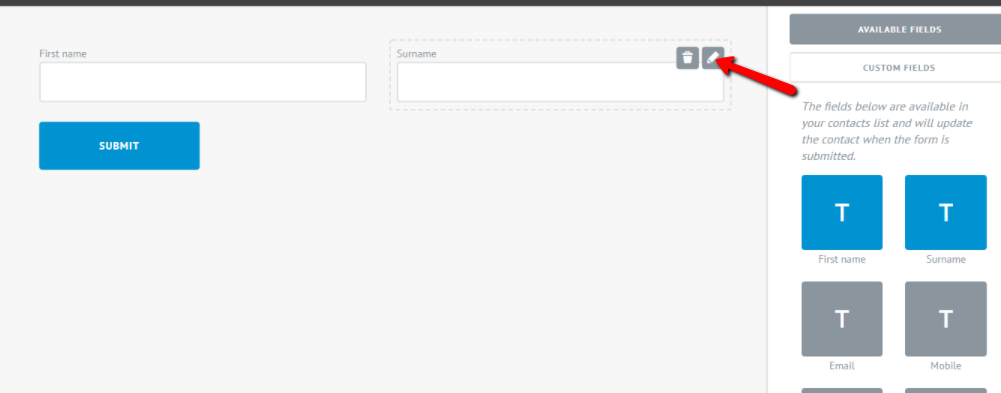 Available Fields are the fields that will be stored in your database. Available Fields are already set up and ready for you to insert into your form. (i.e First Name, Email Address) Custom Fields are fields that you can insert into your form, which will not be stored in the database. (i.e. Function date, Number of Guests)